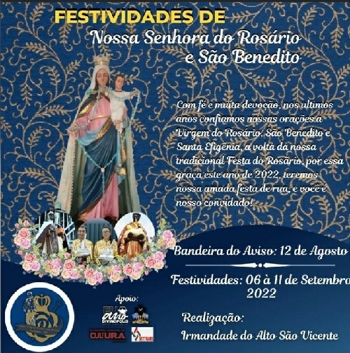 A Prefeitura de Divinópolis, por intermédio da Secretaria Municipal de Cultura (Semc), em conjunto com a Congregação das Irmandades Congadeiras, de Reinado, Festa de Cruz, Folia de Reis e Correlatas de Divinópolis (Congadiv), divulga a programação do levantamento da Bandeira do Aviso na Irmandade do Alto São Vicente.