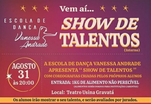 A Prefeitura de Divinópolis, por meio da Secretaria Municipal de Cultura (Semc), apoia a realização do Show de Talentos que a Escola de dança Vanessa Andrade promoverá nesta quarta-feira (31/8), às 20h, no Teatro Municipal Usina Gravatá.