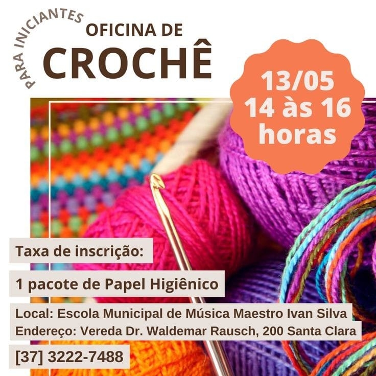 A Prefeitura de Divinópolis, por meio da Secretaria Municipal de Cultura (Semc), informa que a Escola Municipal de Música Maestro Ivan Silva realizará nesta sexta-feira (13/5), de 14h às 16h, a oficina de crochê para iniciantes.