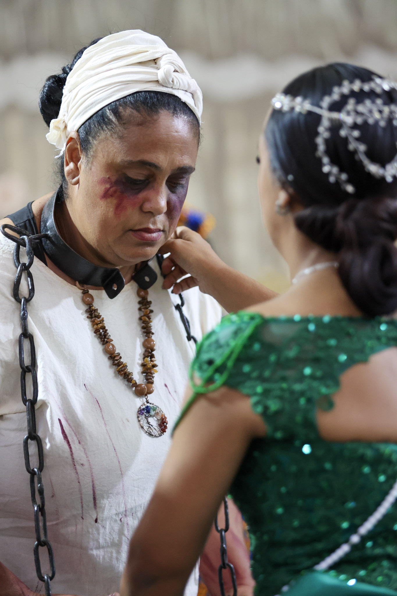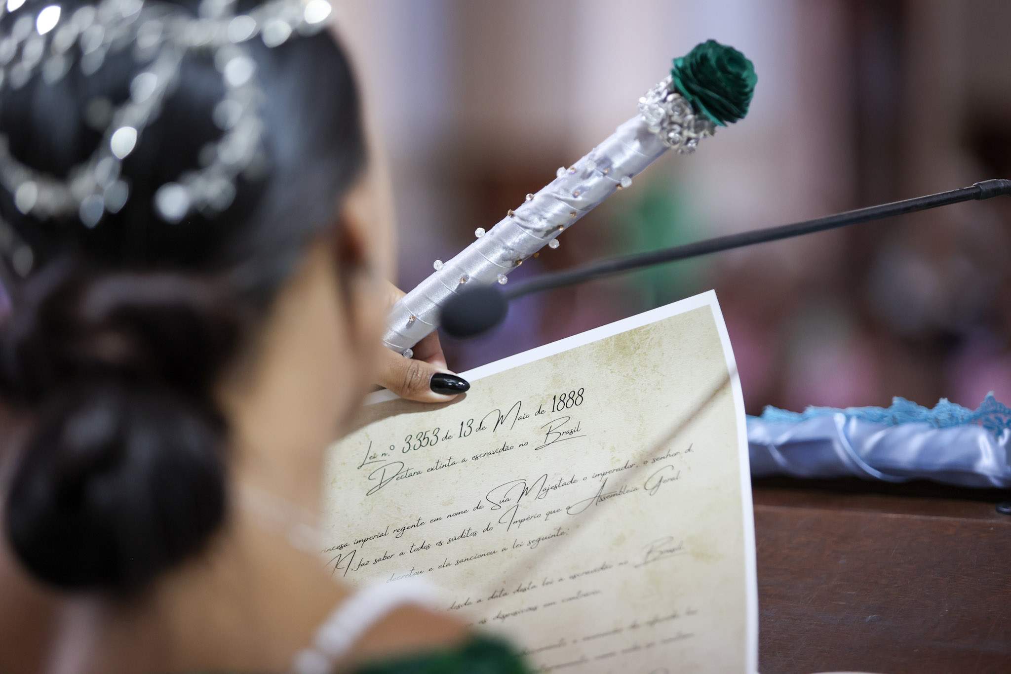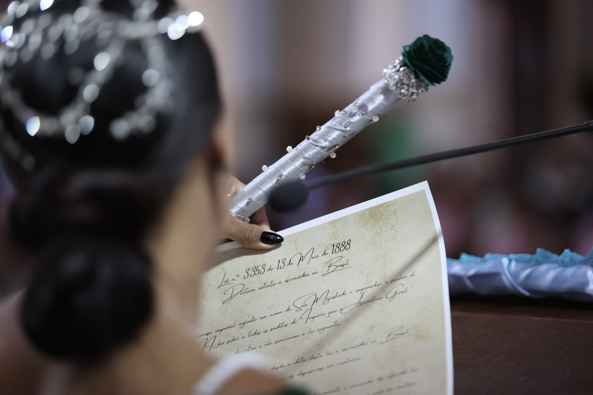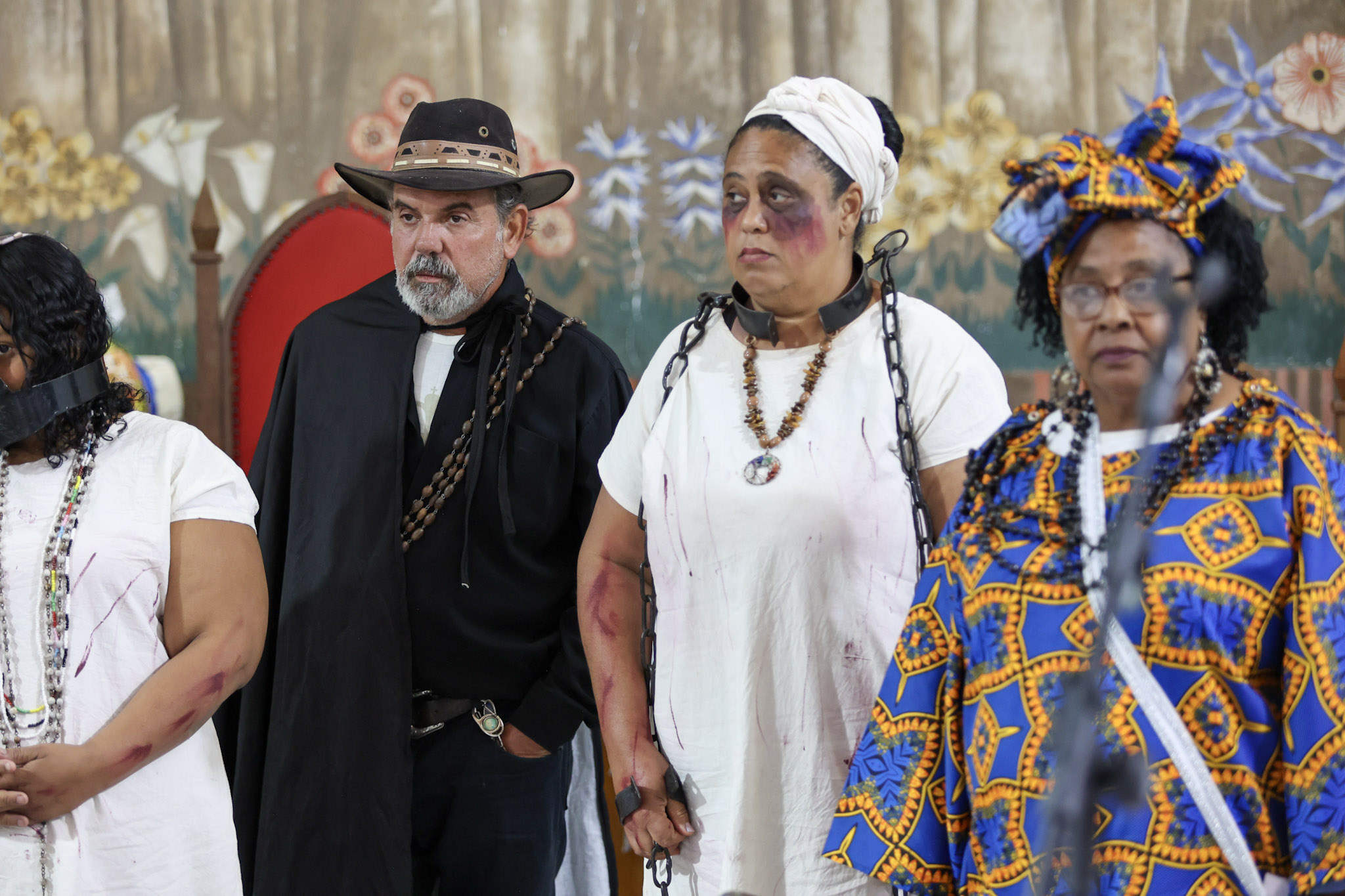 Durante a cerimônia, a leitura da Lei Imperial foi dramatizada com a presença da princesa, das guardas e de escravos acorrentados. Em seguida, as correntes foram retiradas, e o Canto da Libertação foi entoado pelo Terno de Moçambique Nossa Senhora do Rosário, sob a liderança do Capitão Adão.