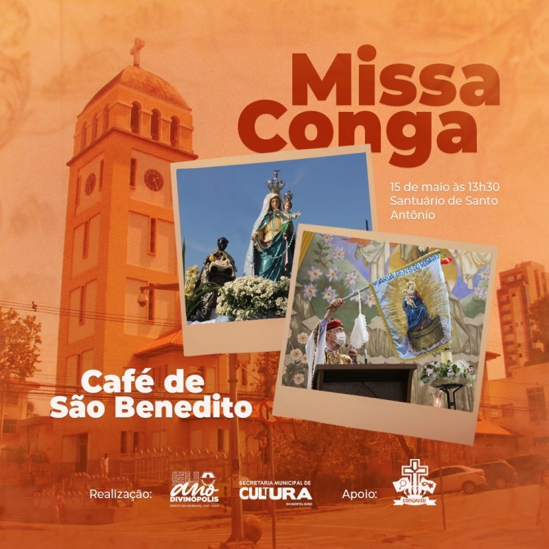 A Prefeitura de Divinópolis, por meio da Secretaria Municipal de Cultura (Semc), em conjunto com a Congregação das Irmandades Congadeiras, de Reinado, Festa de Cruz, Folia de Reis e correlatas de Divinópolis (CongaDiv), realizará neste domingo (15/5), às 13h30, a Missa Conga no Santuário de Santo Antônio.