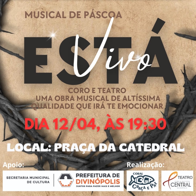A Prefeitura de Divinópolis, por meio da Secretaria Municipal de Cultura (Semc), será apoiadora da apresentação do espetáculo “Vivo Está”, que será realizado neste sábado (13/4), às 19h30, na Praça da Catedral, localizada na Avenida 1º de Junho, no Centro da cidade.