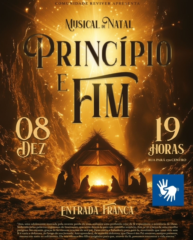 A Prefeitura de Divinópolis, por meio da Secretaria de Cultura (Semc), convida todos para o Musical de Natal "Princípio e Fim", realizado pela Comunidade Reviver. O evento acontecerá em dezembro, no domingo (8/12), às 19h.